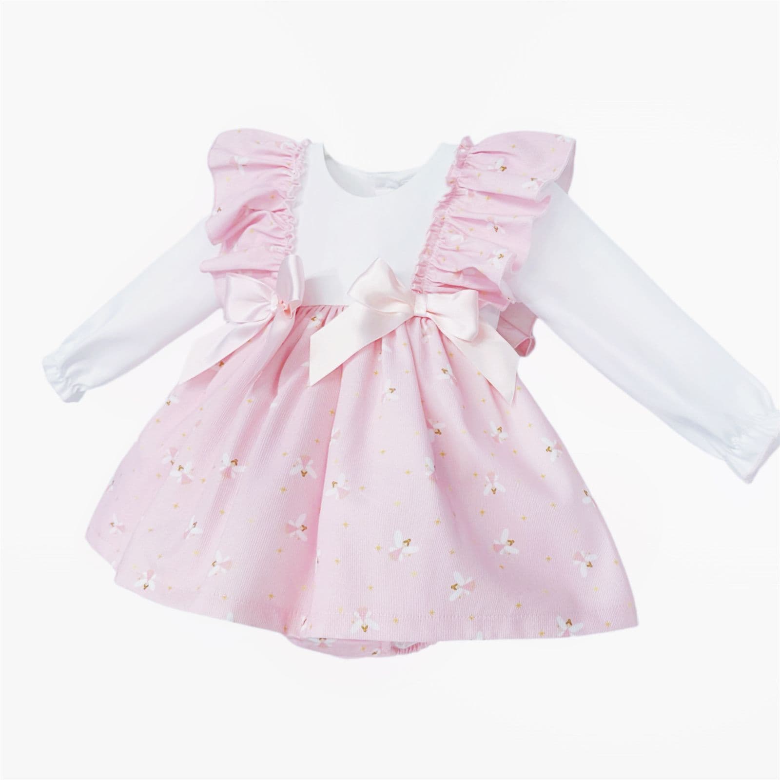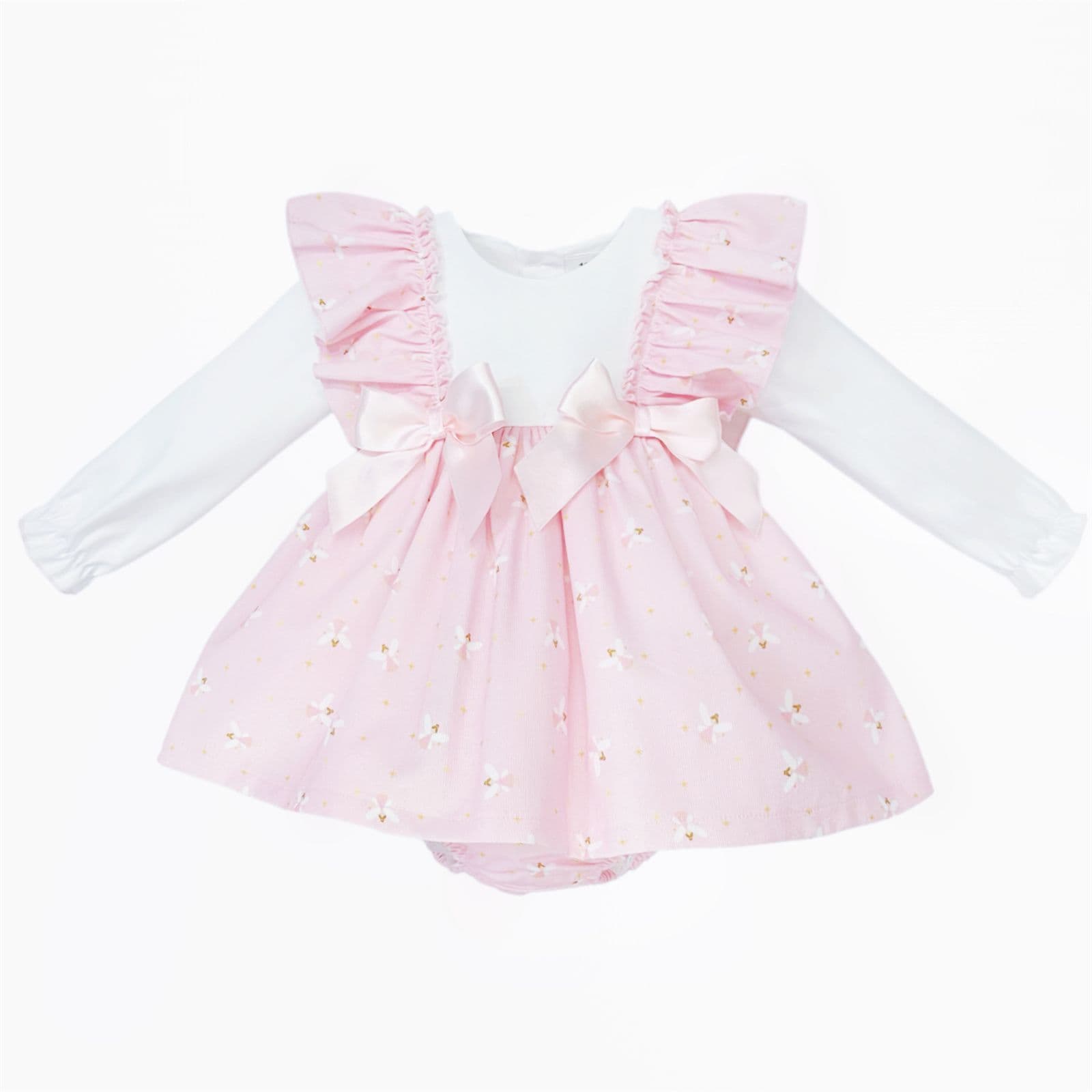 Frilly shoulders and pink bows make this dress perfect for baby girls this season.